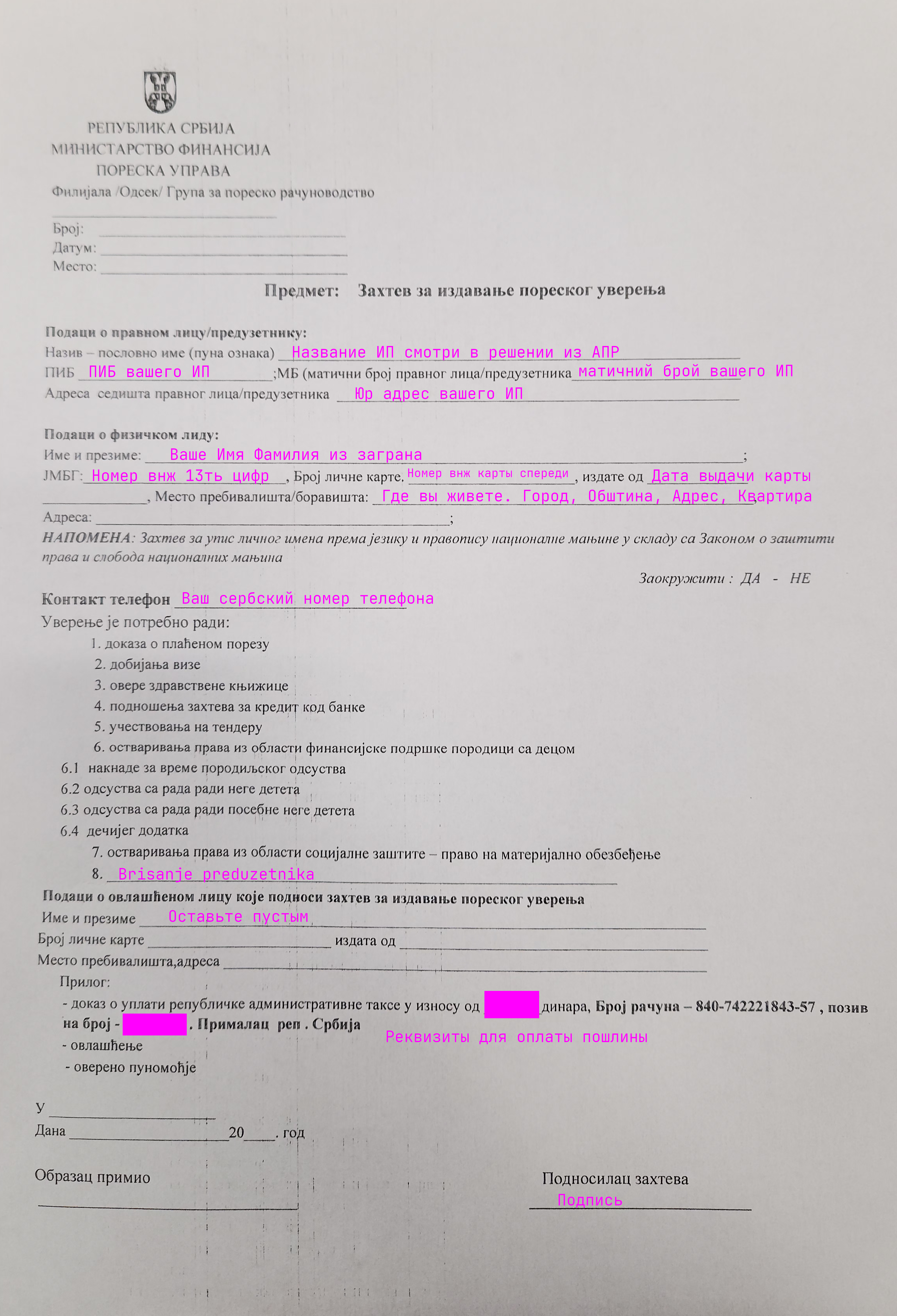 Дополнение: Сложного ничего нет, космических знаний сербского не надо. В Poreska uprava, в 10 окне работает женщина, которая когда поймет, что по-сербски вы не очень понимаете её объяснения, начнет использовать русские слова. В остальном, если в чем-то не уверенны, накидайте простых фраз через GPT, банальное “treba mi brisanje preduzetnika” везде поймут. По деньгам: справка из Пореска управы - 840rsd, из местной налоговой - 350rsd, в АПР - 1300rsd. Ко всем платежам прибавляете комиссию. В заявлении для Gradska Uprava пишите данные Физика, там только ПИБ от ИП и всё. Имя отца тоже обязательно надо написать, например, Владимир, Юрий и т.д. Адрес ИП - виртуальный офис, никаких проблем не было.