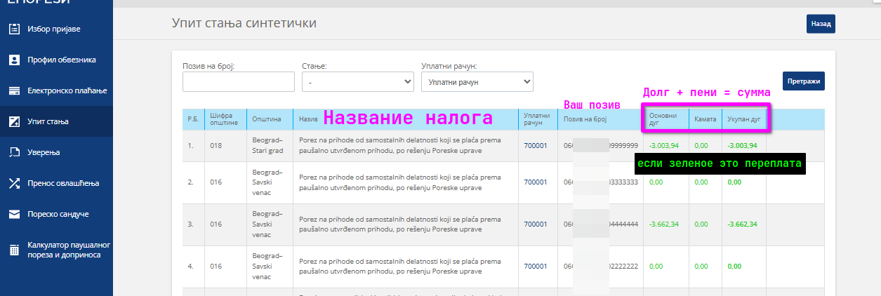 Когда вы поняли за какой период, то рекомендую отфильтровать эту таблицу по позиву на брой. Для этого вверху страницы укажите позив на брой по которому у вас переплата в поле Позив на број и нажимаете Претражи