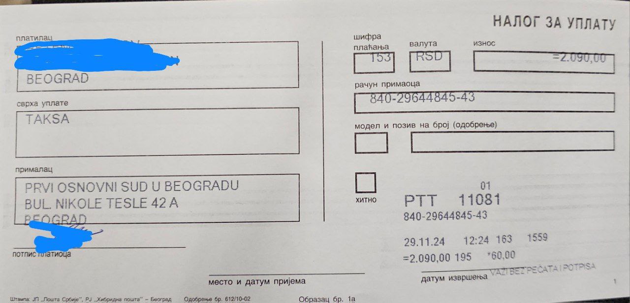 - пошлину ~3100 динар, платежка и оплата на месте, спросят адрес проживания в сербии говорить тот где живете (его проверять никто не будет). Пример платежки