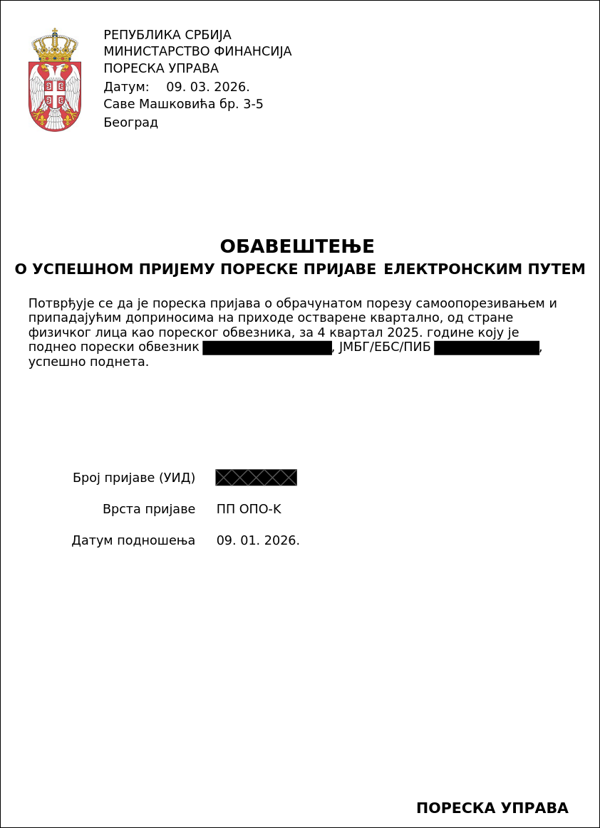 Выписка с портала фриленсеров (ОБАВЕШТЕЊЕ О УСПЕШНОМ ПРИЈЕМУ ПОРЕСКЕ ПРИЈАВЕ ЕЛЕКТРОНСКИМ ПУТЕМ)