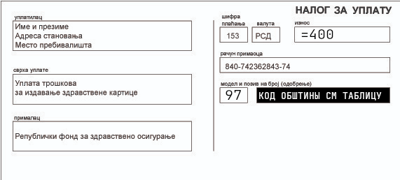 Берете например на почте/банке/менячице платежку и заполняете самостоятельно от руки по примеру (менять только Имя Фамилия, Адрес проживания и Код обштины), заполнять данные человека которому выпускаете карту на каждого свою включая детей, потом оплачиваете. Проверьте что в менячице всё заполнили правильно! Они перепечатывают всё что вы написали и часто совершают ошибки.