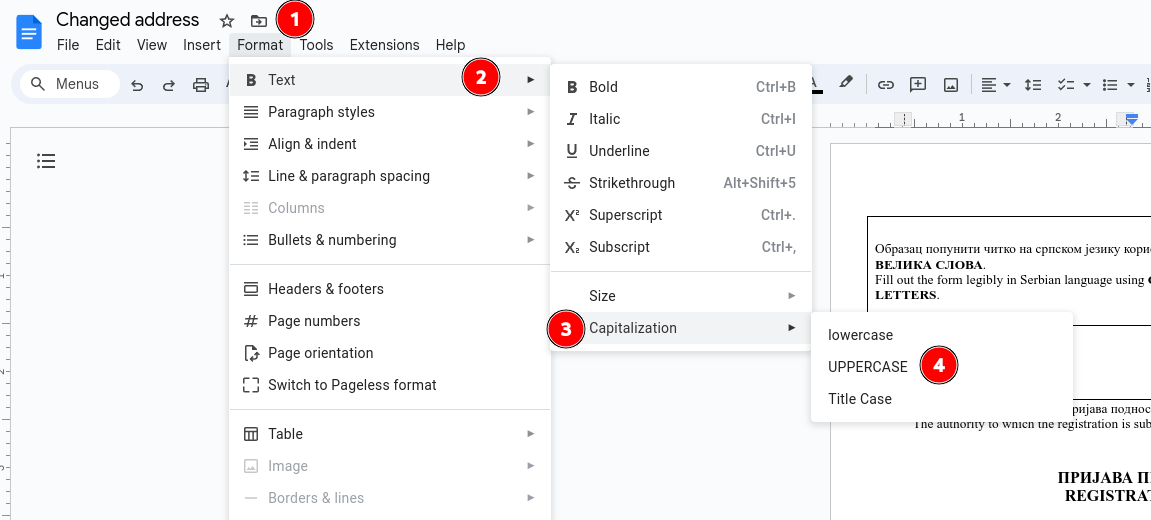 - Если вы заполняете заявление в Google Docs, то можно легко превратить все буквы в заглавные. Выделите нужный текст и делайте по примеру.