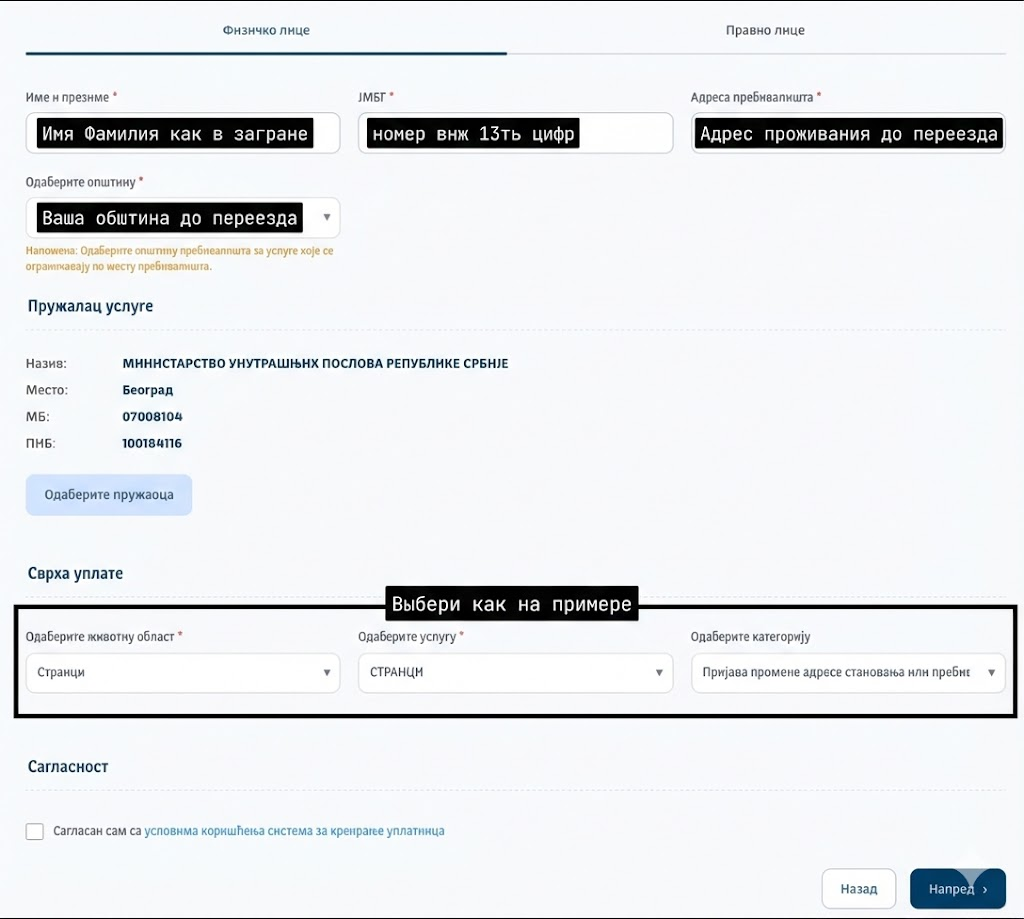 - НЕЛЬЗЯ указывать чужой JMBG (номер ВНЖ 13ть цифр), это номер должен быть ТОГО ЧЕЛОВЕКА за которого платите, если у человека его нет, то этот метод оплаты НЕ ПОДХОДИТ.