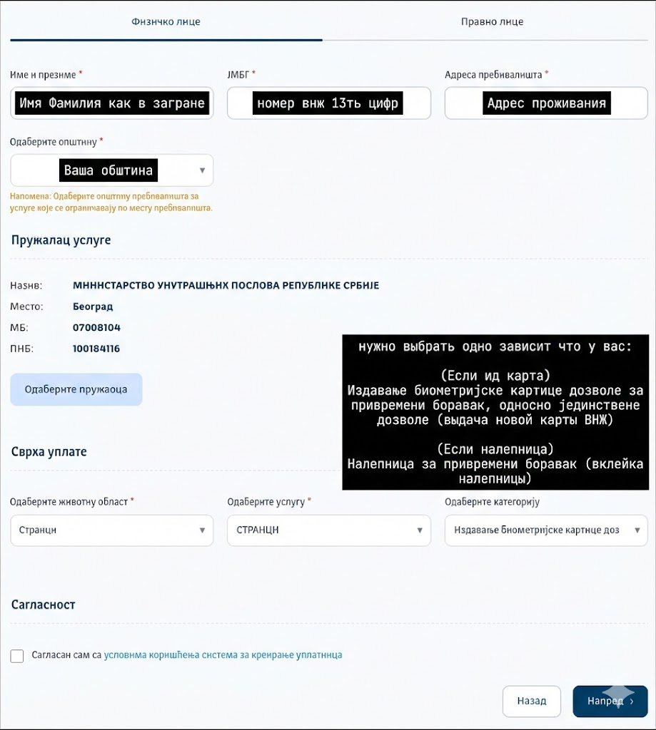 - НЕЛЬЗЯ указывать чужой JMBG (номер ВНЖ 13ть цифр), это номер должен быть ТОГО ЧЕЛОВЕКА за которого платите, если у человека его нет, то этот метод оплаты НЕ ПОДХОДИТ.